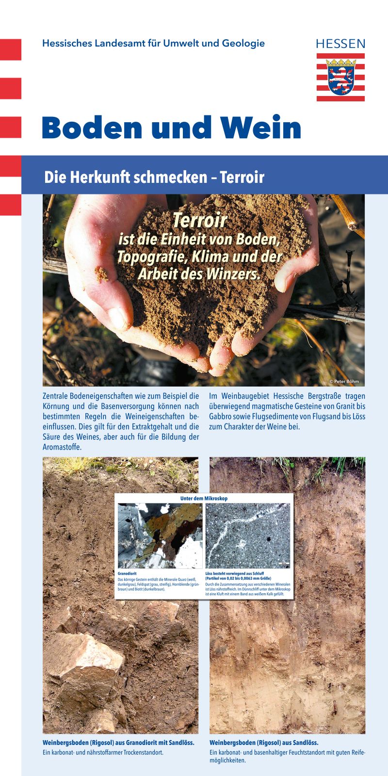 Die Ausstellung präsentiert einen Querschnitt von der Bodenentstehung über Bodenbestandteile und -leben bis hin zur Charakterisierung der bodenbedingten Landnutzung und der Bodendiversität in der Landschaft. Es werden Bodenschutzaspekte aufgezeigt und mit eindrucksvollen Bodenprofilen auch das Potenzial des Bodens für den Wein erläutert. Die einzelnen Präsentationsobjekte können Sie im Detail unten ersehen.