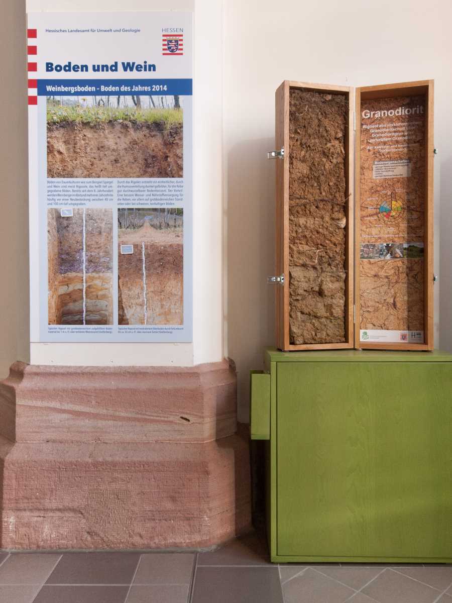 Die Ausstellung präsentierte einen Querschnitt von der Bodenentstehung über Bodenbestandteilen und -leben bis hin zur Bodennutzung und der Bodendiversität in der Landschaft. Es wurden Bodenschutzaspekte aufgezeigt und mit eindrucksvollen Bodenprofilen auch das Potenzial des Bodens für den Wein aufgezeigt.
