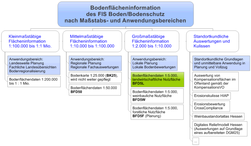 Die bodenkundliche Aufarbeitung der Bodenschätzungsdaten ist ein zentraler Baustein bei der Erstellung flächendeckender Kartenwerke und Informationssysteme in Hessen (vgl. Abbildung). Dieser auf die landwirtschaftliche Nutzfläche bezogene Datenbestand wird für die Weinbauflächen durch die Weinbergsbodenkartierung (BFD5W) und für die Forstflächen in Zukunft ggf. noch durch Daten der Forstlichen Standortkartierung (BFD5F) ergänzt.