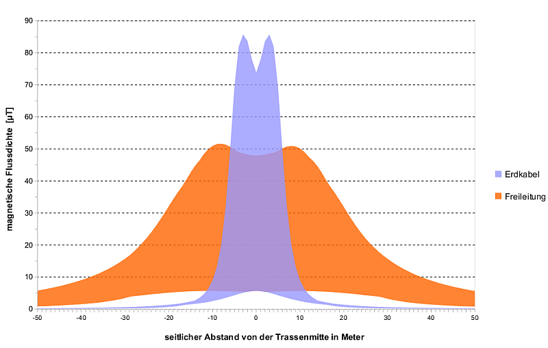 Freileitungen nehmen nicht isolierte Seile auf, die über eine größere Entfernung das elektrische und magnetische Feld emittieren. Erdkabel können aufgrund ihrer Isolierung dichter verlegt werden. Durch die Isolierung und Verlegung im Erdreich ist die Immission der Erdkabel ab einer gewissen Entfernung im seitlichen Abstand geringer als bei vergleichbaren Freileitungen.