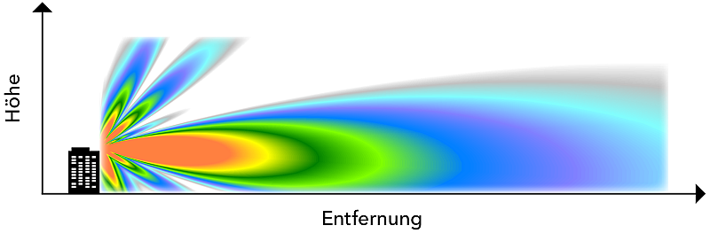 Der Gebrauch von Mobilfunktelefonen erfordert eine größere Anzahl von Mobilfunksendeanlagen. In der folgenden Abbildung ist die Abstrahlgeometrie einer Mobilfunk-Sektorantenne, die auf einem Haus montiert ist, dargestellt. Erkennbar sind neben dem Hauptstrahl auch die Nebenstrahlen, die in einem geringeren Abstand als der Hauptstrahl auf den Boden treffen.