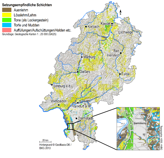 Setzungsempfindliche Schichten sind in Hessen weit verbreitet. Als besonders setzungsempfindlich zählen Böden mit einem hohen Maß an organischem Anteil oder einem Feinkornanteil (Ton) > 20%. In Hessen gehören dazu die tertiären Tone, Auensedimente, tonig-schluffige Verwitterungsprodukte sowie Torf. Diese Schichten treten in ganz Hessen, insbesondere in Tälern und Senken auf. Tertiäre Tone treten u. a. als Frankfurter Ton oder Rupelton im Rhein-Main Ballungsgebiet auf (Abb.1).