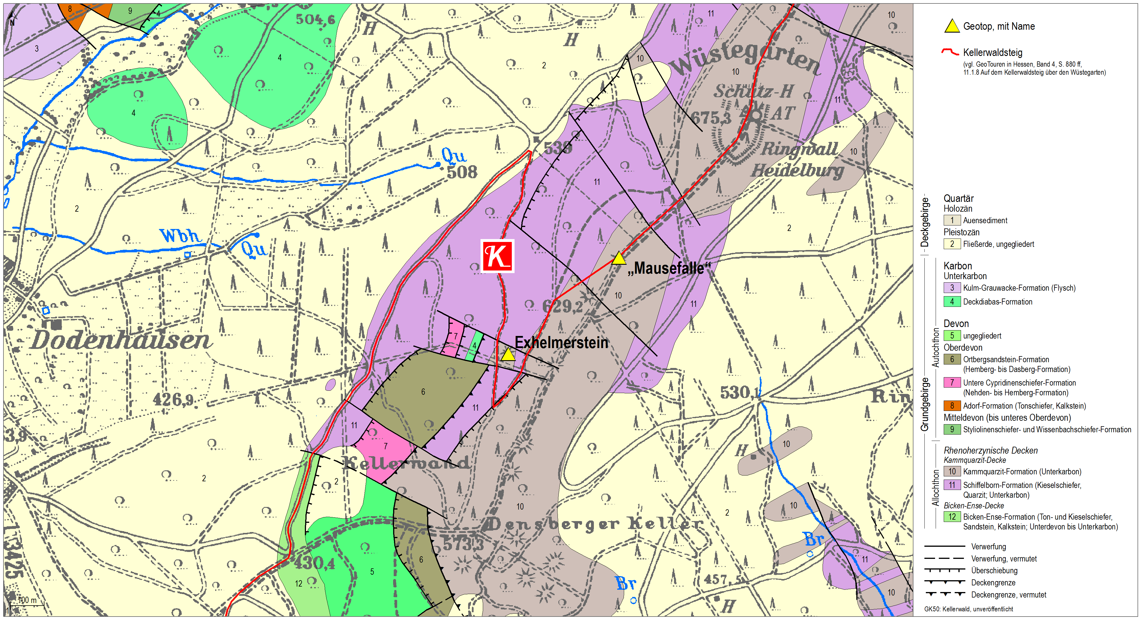Der Hohe Keller, das Bergmassiv im südlichen Kellerwald, zwischen den Örtchen Schönstein, Dodenhausen, Haddenberg, Bergfreiheit, Oberurff, Jesberg und Densberg wird aus sehr verwitterungsresistenten quarzitischen Sandsteinen, dem sogenannten Kellerwald- oder Wüstegartenquarzit aufgebaut. Auf den breiten Kammlagen des Hohen Kellers haben sich in der letzten Eiszeit große Blockschutthalden und bizarre Felsklippen gebildet. Besonders auffällige Klippen sind die „Exhelmer Steine“ und die wegen ihrer Form sogenannten „Mausefalle“, ein markant vorkragender Einzelfels, die vom nur wenige Meter entfernt verlaufenden Kellerwaldsteig bestaunt werden können.