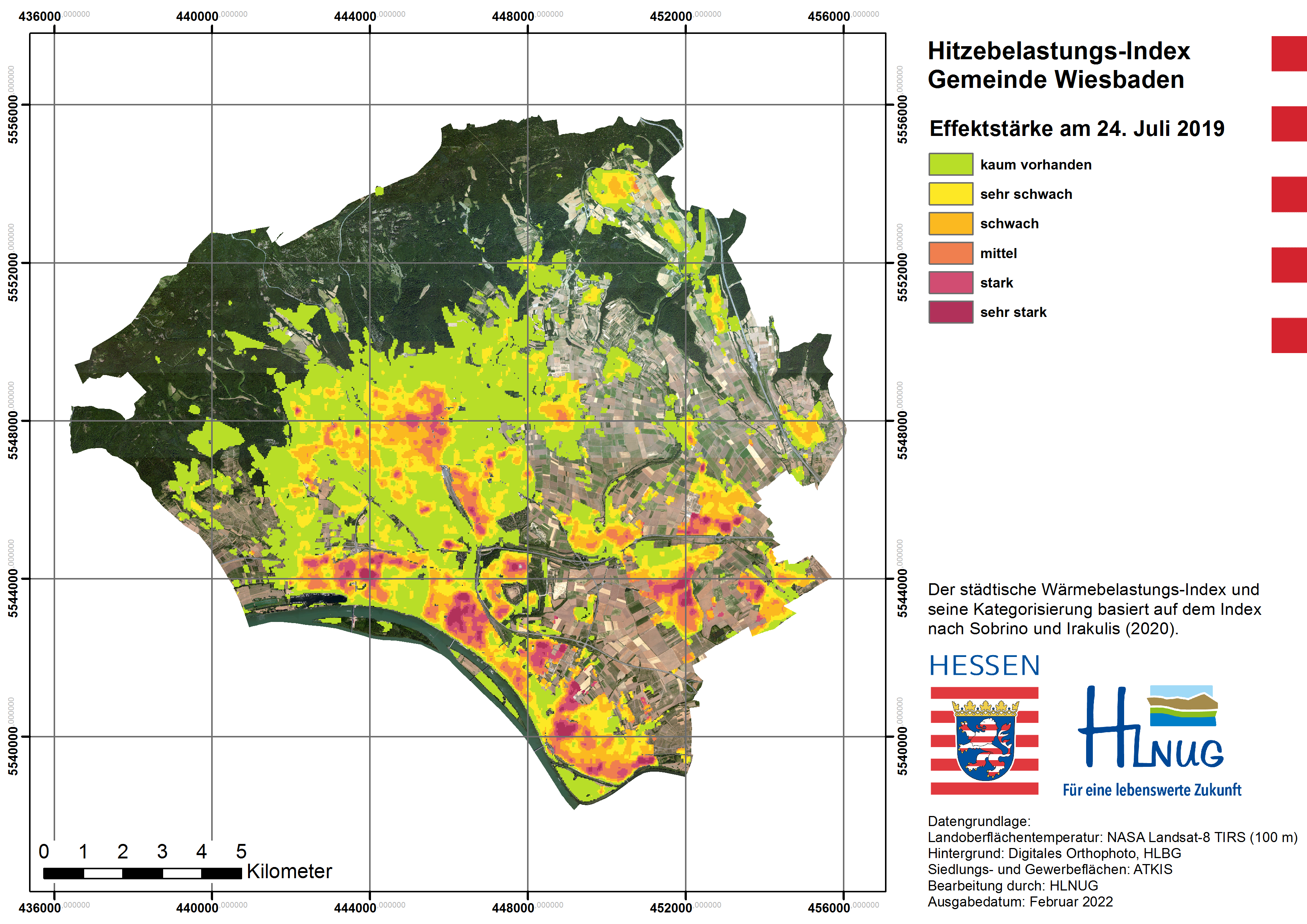 Der gezeigte Hitzebelastungsindex nennt sich UTFVI (Urban Thermal Field Variance Index). Der Index setzt die durchschnittliche Oberflächentemperatur der Kommune in Bezug zu der Oberflächentemperatur an allen Punkten der Siedlungs- und Gewerbeflächen der Kommune. Die damit erhaltenen Werte werden (von "kaum vorhanden" bis "sehr stark") kategorisiert und in Effektstärken (von grün bis rot) dargestellt.