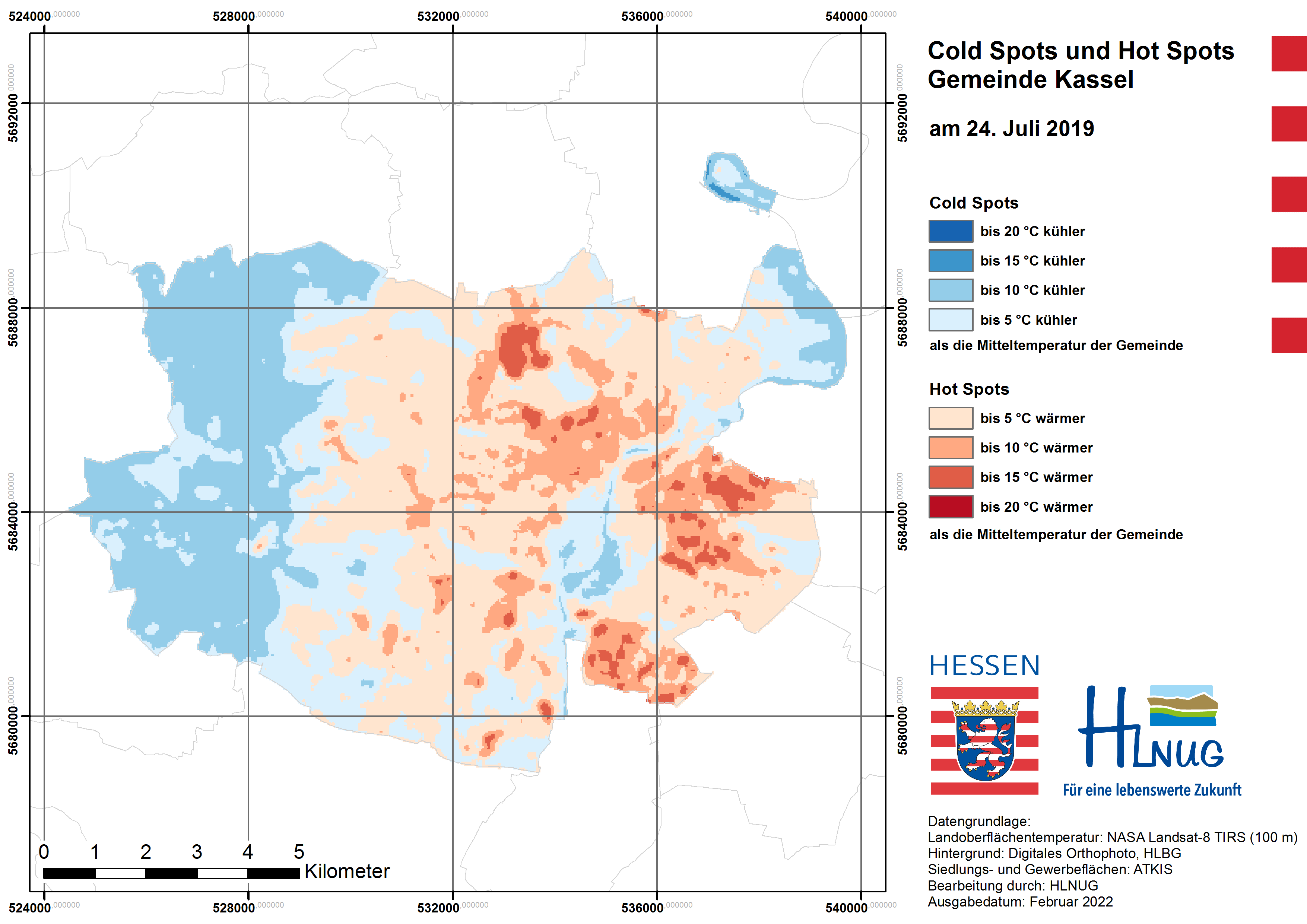 Die Karte zeigt Cold Spots und Hot Spots beispielhaft für die Stadt Kassel am 24.07.2019 (wolkenfreier Tag in ganz Hessen). Diese Analyse steht für alle Kommunen Hessens zur Verfügung! Im Viewer können die Kommunen einzeln (Klick auf das Gemeindegebiet in der Karte) abgerufen werden. Für die Analyse wurde die durchschnittliche Oberflächentemperatur des gesamten Gemeindegebiets für einen Tag (24.07.2019) ermittelt. Die Temperaturen der einzelnen Oberflächen unterscheiden sich selbstverständlich von diesem Mittelwert. Blautöne zeigen Gebiete der Kommunen, die kühler als die Oberflächen-Mitteltemperatur der Kommune sind und Rottöne zeigen Bereiche die wärmer als die Oberflächen-Mitteltemperatur der Kommune sind. Somit werden die Cold Spots und Hot Spots sichtbar.