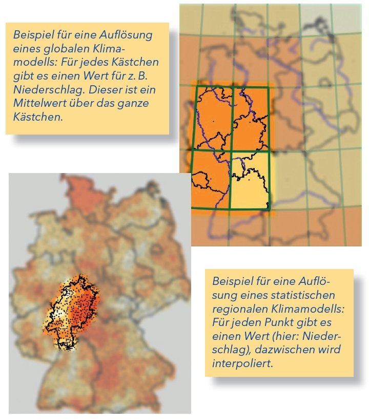 Modelle auf globaler Ebene haben häufig eine sehr grobe Auflösung (ca. 100*100 km), sind also räumlich recht ungenau. Damit die Klimaprojektionen für Deutschland besser nutzbar sind, werden die Globalmodelle mit regionalen Klimamodellen gekoppelt. Damit ist eine Auflösung mit einer Gitterweite von 12 km möglich. Diese Auflösung ist in der Anwendung Klima der Zukunft in Hessen noch einmal auf 5 km verfeinert und für die elf hessischen Naturräume gemittelt worden.