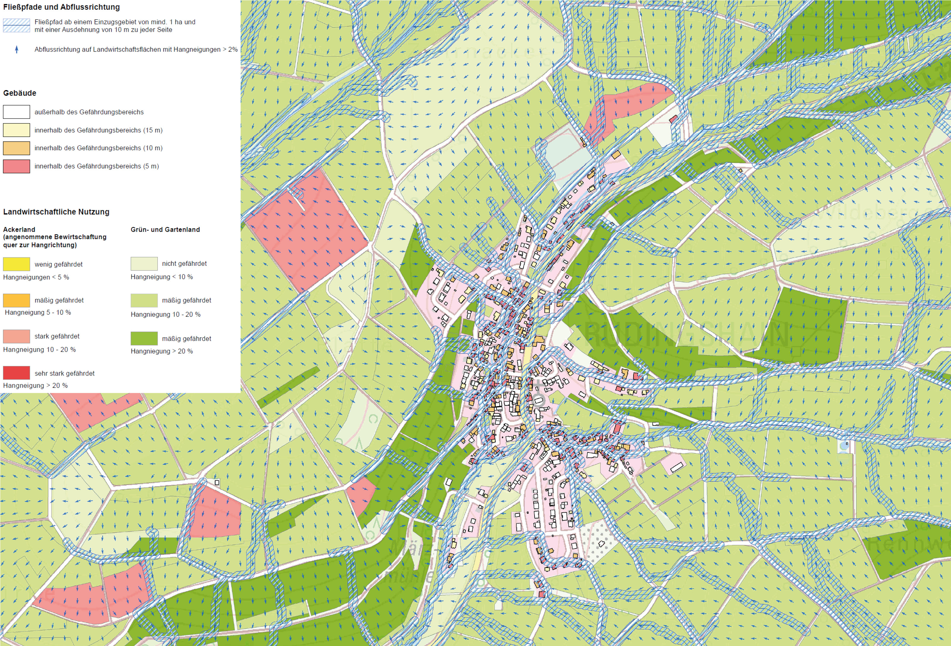 Einbezogen werden Hangneigungen in unterschiedlichen Abstufungen, Landnutzungen und Gebäudeinformationen. Die Fließpfade werden mit einem Puffer von 20 m dargestellt, um die Gefährdung von Gebäuden oder anderer Infrastruktur besser sichtbar zu machen. Die Wirkungen von Gräben, Durchlässen und der Kanalisation sind in der Regel nicht berücksichtigt, so dass diese Karten für stark verdichtete Flächen (z. B. Großstädte) nicht herangezogen werden sollten.