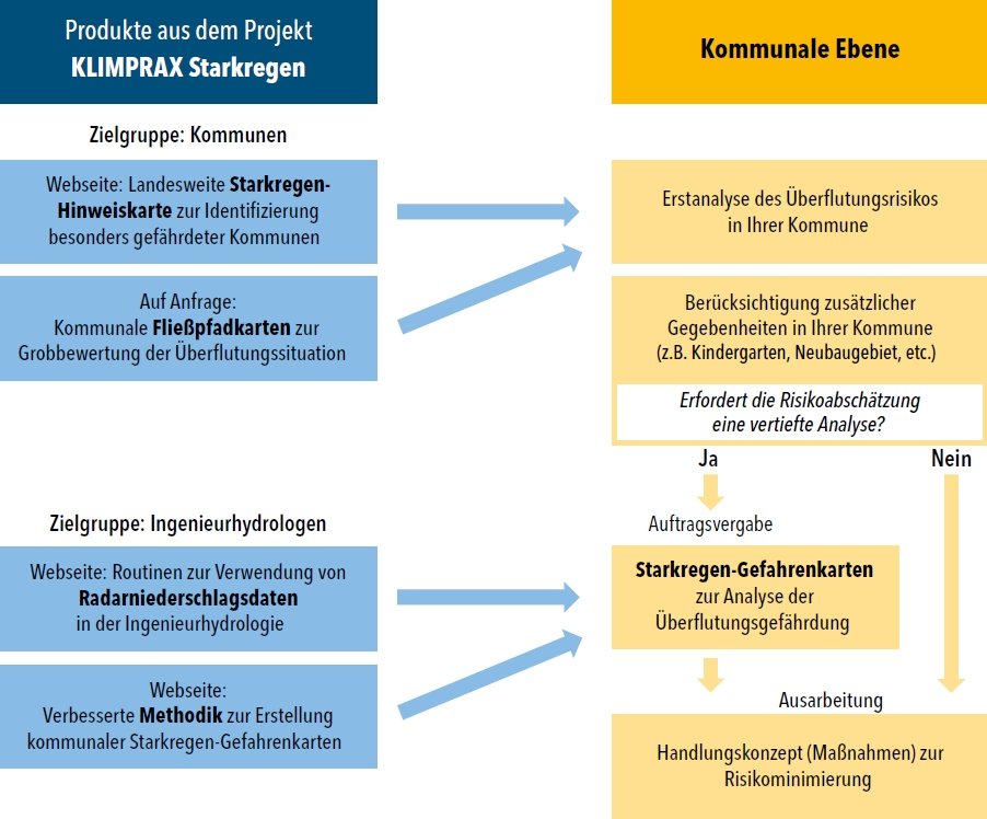 In einem ersten Schritt dient die Starkregen-Hinweiskarte dazu, einen Überblick über das Überflutungsrisiko bei Starkregen in der Region zu ermöglichen. Kommunale Fließpfadkarten geben eine örtliche Übersicht über das potenzielle Überflutungsrisiko und die Fließwege des Wassers bei Starkregen in einer Kommune. Diese Karten enthalten jedoch nicht alle den Abfluss des Wassers beeinflussenden Faktoren (z.B. sind keine Kanalnetze enthalten).