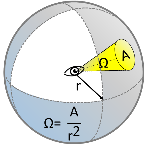 Die sichtbare Fläche der Blendquelle wird als Raumwinkel gemessen. Der Raumwinkel ist das dreidimensionale Äquivalent zum ebenen Winkel und wird in [sr] (Steradiant) angegeben. Dieser Wert beschreibt den Umstand, dass eine Lichtquelle mit zunehmendem Abstand kleiner wahrgenommen wird (siehe Abbildung).