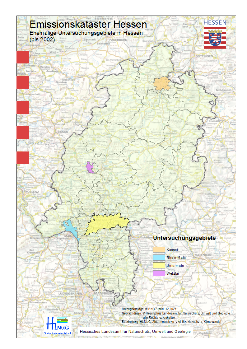 Diese vier damaligen Untersuchungsgebiete stellen nur knapp 4 % der Gesamtfläche Hessens dar; in ihnen lebt jedoch etwa ein Viertel der hessischen Bevölkerung. Ausschlaggebend für die seinerzeitige Ausweisung als Belastungsgebiet bzw. als Untersuchungsgebiet war die Überschreitung von Immissions-Grenzwerten bei Schwefeldioxid und Staub. Für diese vier Gebiete, in denen die emittierten Schadstoffe bereits seit 1979 detailliert erfasst werden, wurden in den 80er und 90er Jahren umfangreiche Luftreinhaltepläne erstellt.