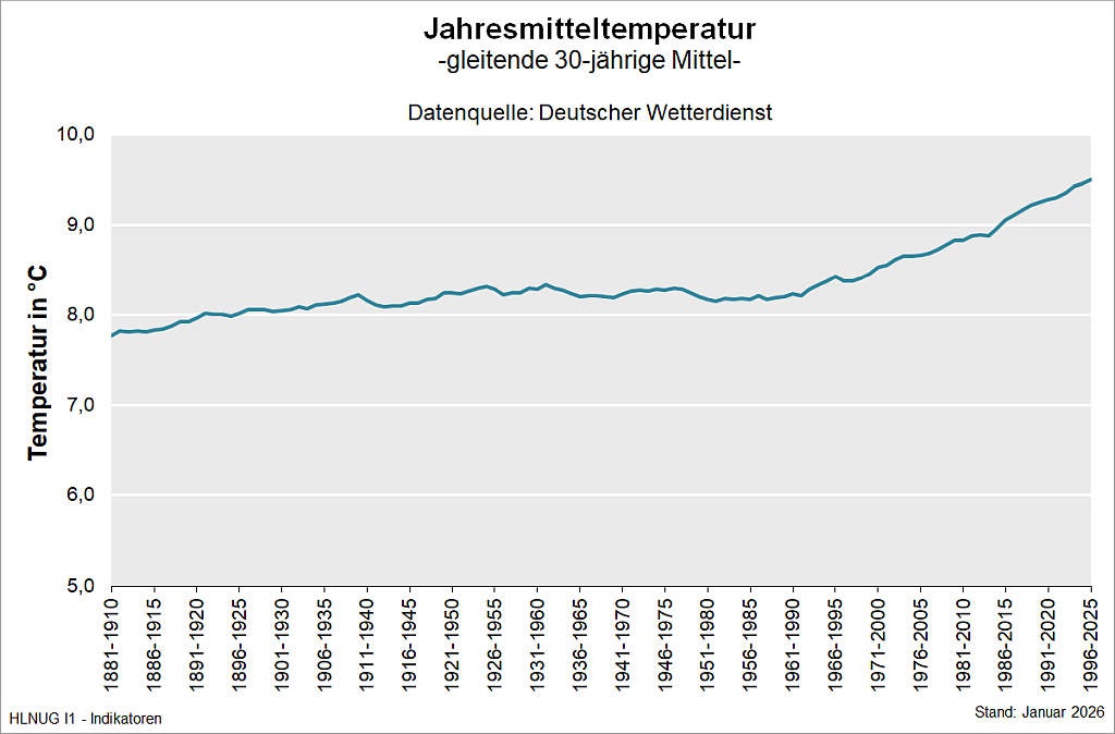 Die 30jährige Mitteltemperatur erhöhte sich vom Zeitraum 1881-1910 mit 7,8 °C um 1,7 °C auf 9,5 °C für den Zeitraum 1996-2025.