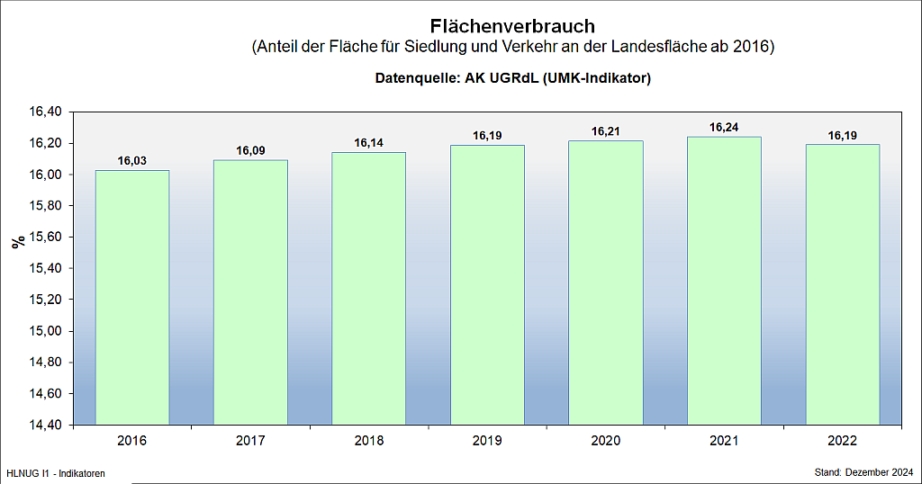 Zur Berechnung des Anteils der Fläche für Siedlung und Verkehr an der Landesfläche wird die Fläche für Siedlung und Verkehr in Beziehung zur Gesamtfläche des Landes Hessen gesetzt (Zeitreihe ab 2016).