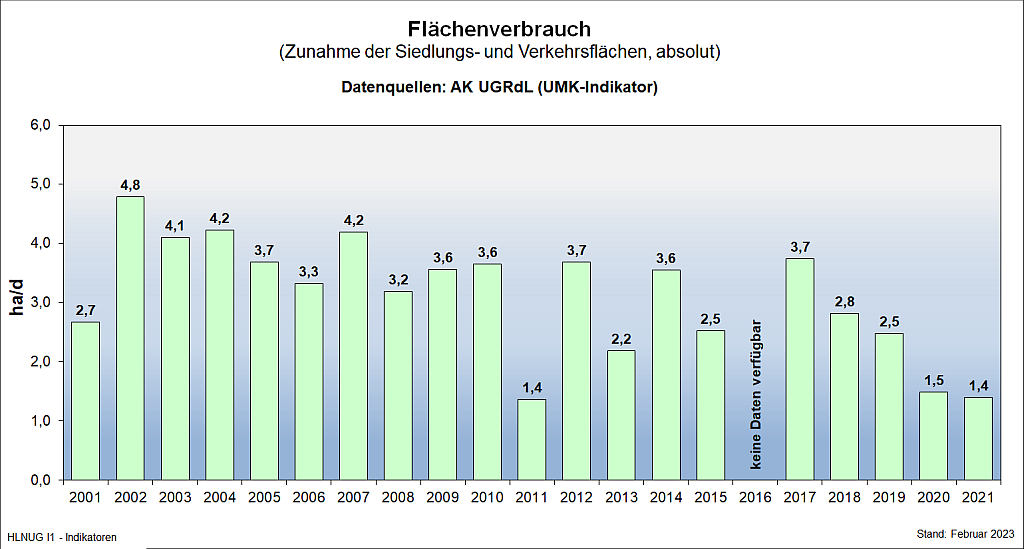 Die Zunahme von Flächen für Siedlungs- und Verkehrszwecke stellt einen Schlüsselindikator für die Nachhaltigkeit der Raumnutzung dar. Die mit diesem Flächenverbrauch verbundenen Umweltschädigungen sind in der Regel schleichend und treten erst über lange Zeiträume auf. Die Folgewirkungen sind auf den ersten Blick nur schwer zu erkennen und werden zum Teil deutlich unterschätzt. Durch die Umnutzung von Freiflächen in Flächen für Siedlungs- und Verkehrszwecke gehen infolge der (Teil-)Versiegelung ökologische Funktionen des Bodens verloren - ebenso wie Lebensräume für Flora und Fauna. Mit dem Ausbau der Infrastruktur ist häufig auch eine Zunahme des Verkehrsaufkommens verbunden. Somit induziert der Flächenverbrauch auch indirekt weitere Umweltbelastungen, die über die in Anspruch genommen Flächen hinausgehen. Die durchschnittliche tägliche Flächeninanspruchnahme des jeweiligen Jahres wird als Indikator verwendet, da sie eine sehr anschauliche und inzwischen weithin bekannte Größe ist.