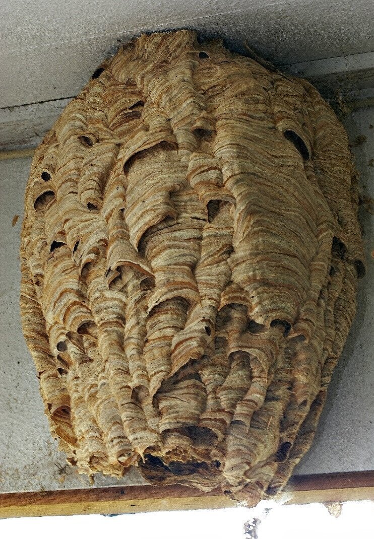 - Brutwabe durch eine Nesthülle geschützt. Der Nesteingang befindet sich in der sozialen Phase an der Seite des Nestes