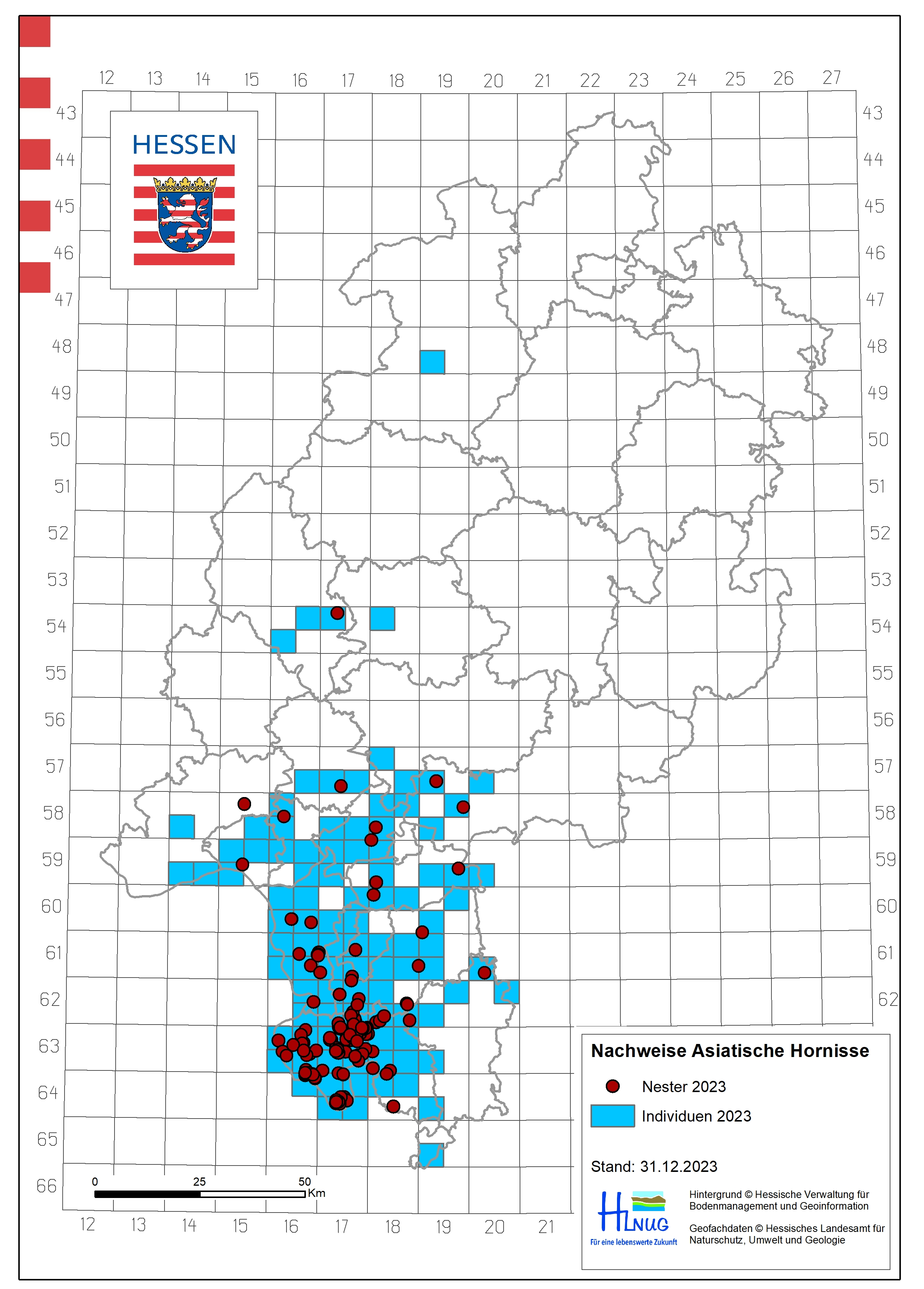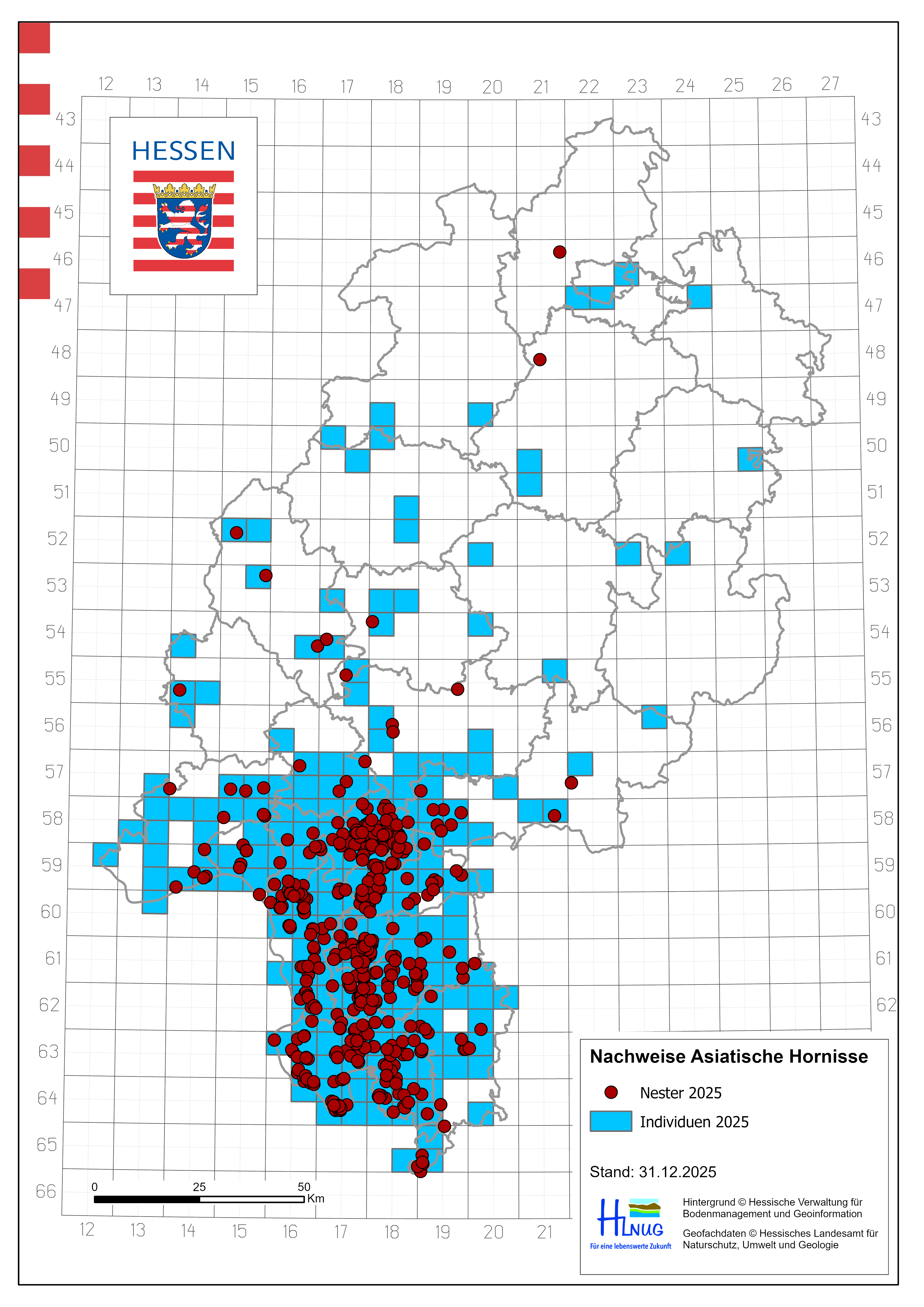 Im Jahr 2025 breitete sich die Asiatische Hornisse in Mittel- und Nordhessen weiter aus. Die Anzahl der Nester hat sich von 280 im Jahr 2024 auf 488 fast verdoppelt. In Mittelhessen wurden nunmehr sieben Nester gemeldet (Lahn-Dill-Kreis, Gießen), in Nordhessen gab es zwei Nestmeldungen (Landkreis Kassel, Schwalm-Eder-Kreis). Erste sichere Sichtmeldungen von Einzelindividuen gab es in den Landkreisen Waldeck-Frankenberg, Kassel, Werra-Meißner-Kreis, Hersfeld-Rothenburg, Fulda, Schwalm-Eder-Kreis – die Asiatische Hornisse hat sich 2025 in ganz Hessen etabliert. Für 2026 wird eine weitere Ausbreitung der Asiatischen Hornisse in Hessen erwartet.