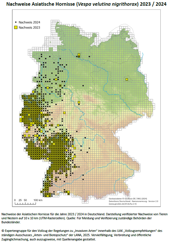 Im Jahr 2023 kam es zu einem sprunghaften Anstieg an Meldungen der Asiatischen Hornisse. Für 2024 konnten ebenfalls ein Anstieg an Meldungen verzeichnet werden. Gründe für den Anstieg an Meldungen können neben der tatsächlichen Ausbreitung auch die mediale Aufmerksamkeit der Presse und das zunehmende Wissen von Bürgerinnen und Bürger durch Informationen durch Behörden, Imkervereine sowie Vortrags- und Schulungsangebote sein.