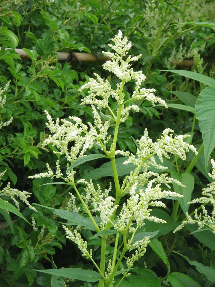 Merkmale: Ausdauernde Staude, bis zu 180 cm hoch, mit kräftigen, knotig gegliederten Stängeln, schwach behaart und rötlich-braun. Mächtiges unterirdisches Sprosssystem. Blätter gestielt, bis zu 30 cm lang und etwa 10 cm breit, eiförmig lanzettlich, allmählich in eine Spitze auslaufend, Blattunterseite behaart, Blattgrund pfeil- oder herzförmig. Blüten 3-5 mm lang in lockeren Rispen. Früchte 3-5 mm lang, braun, dreiseitig.