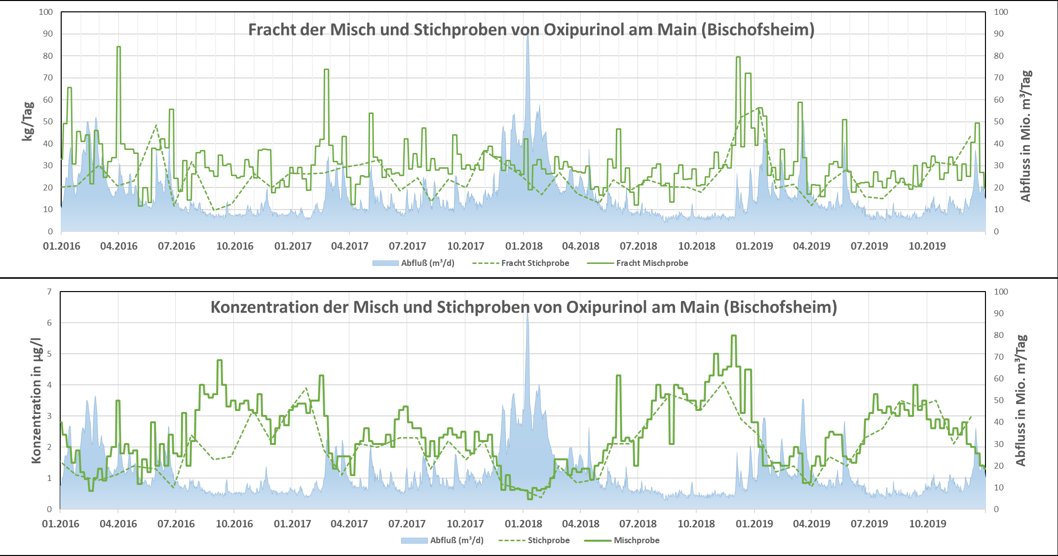 Der Verlauf der Konzentration des Stoffs Oxipurinol, der in üblichen kommunalen Kläranlagen keinem nennenswerten Abbau unterliegt, ist in der folgenden Abbildung in Abhängigkeit vom Abfluss an der Messstation Main (Bischofsheim) dargestellt. Deutlich zu erkennen ist der verdünnende Effekt bei hohem Abfluss. Dabei bleibt die Fracht, also die pro Zeit transportierte Substanzmenge, relativ konstant, da die Eintragsmenge durch die Kläranlagen nicht vom Abfluss des Gewässers abhängt.
