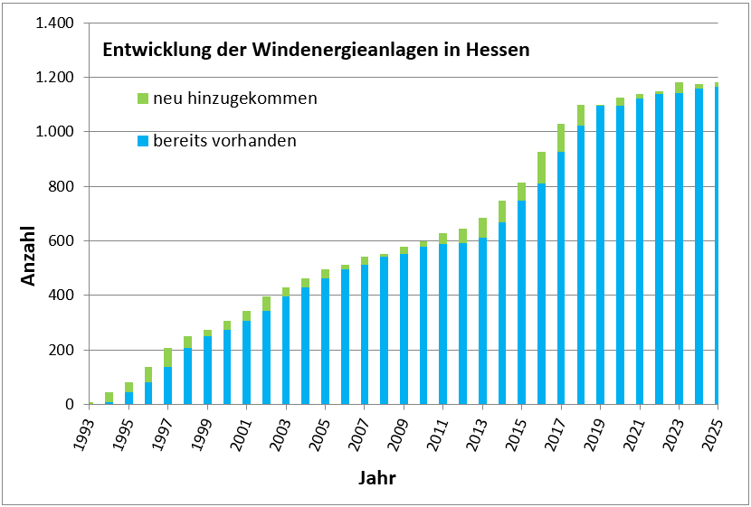 Windenergieanlagen sind seit 2001 ab einer Gesamthöhe von 35 Metern und seit 2005 ab einer Gesamthöhe von 50 Metern nach dem Bundes-Immissionsschutzgesetz genehmigungsbedürftig. In der Abbildung 1 ist die Entwicklung der Anlagenzahlen der Windenergieanlagen aufgeführt. Dabei wird zwischen den im Jahr bereits vorhandenen Anlagen und den neu hinzugekommenen Anlagen unterschieden.